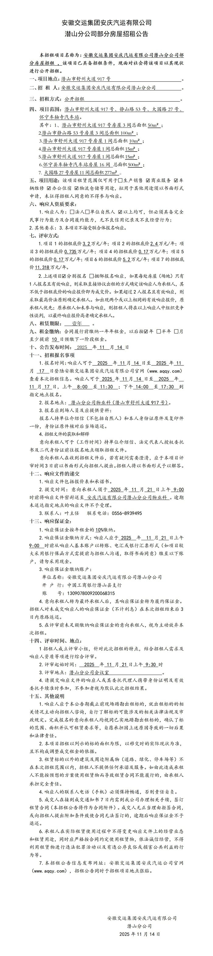 潛山分公司部分房屋招租公告