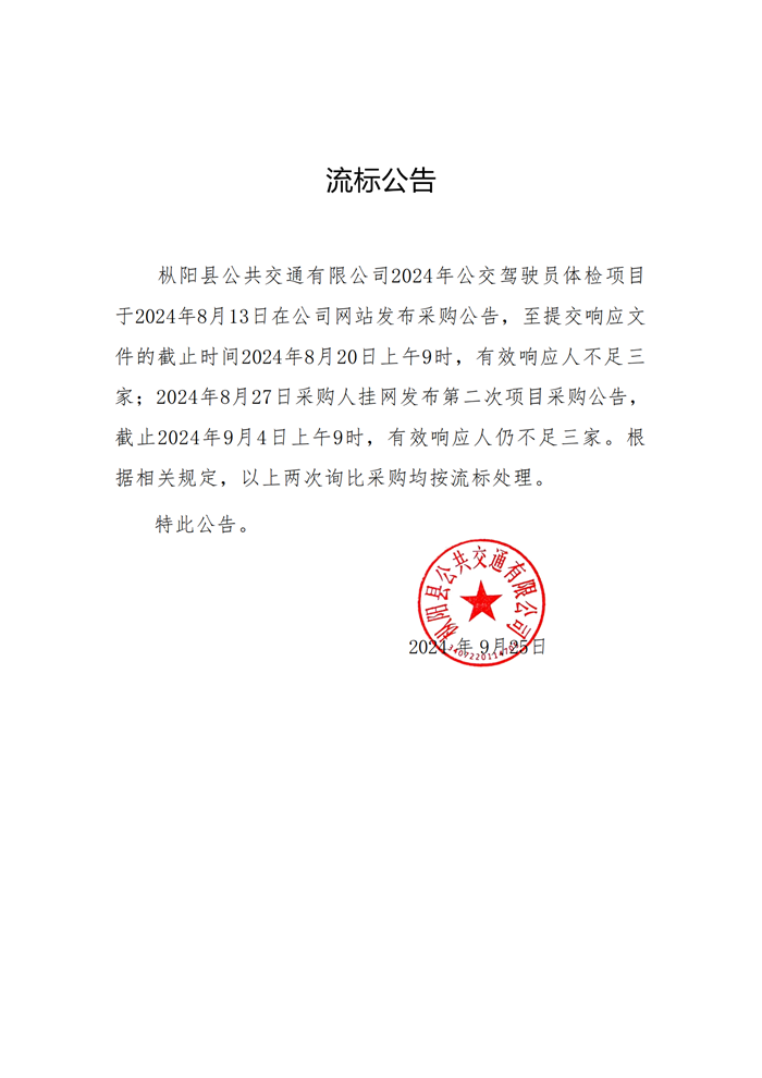 樅陽公交駕駛員體檢項目流標(biāo)公告
